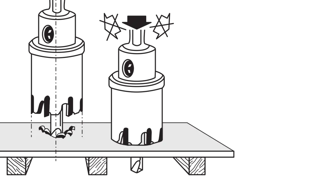 Exert a low and even pressure on the workpiece as soon as the cutter touches the material. Using the pilot drill guide the tool straight over the surface of the workpiece.